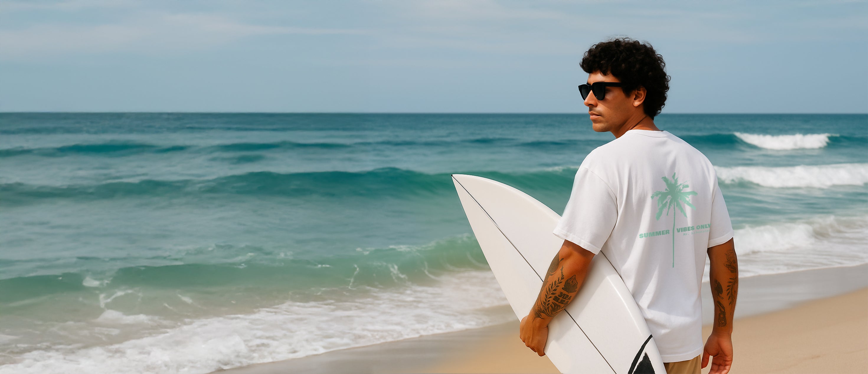 Locker geschnitten, länger, ready for Beach & City. Dieses Oversized Tee bringt Surfvibes, Sonne und Palmen in deinen Alltag – minimal im Look, maximal entspannt.
